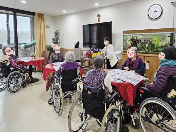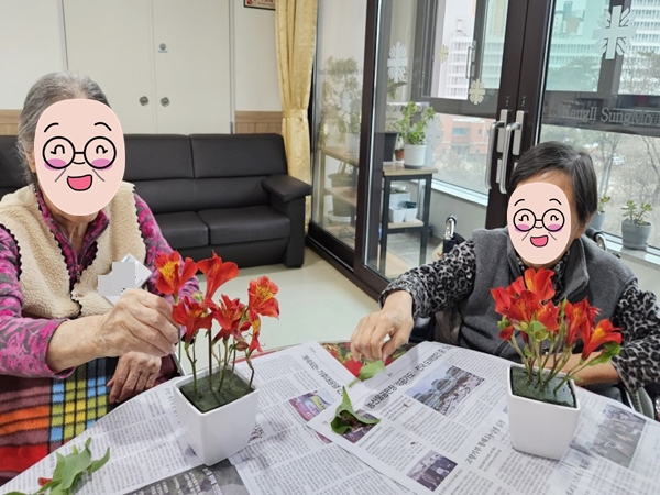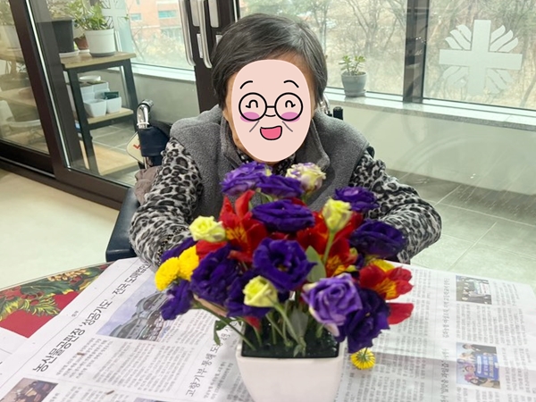 1/13(월) 4층 생활층에서 알스트로메리아, 리시안셔스, 테디베어해바라기 생화를 이용하여 꽃꽂이 활동을 진행하였습니다.