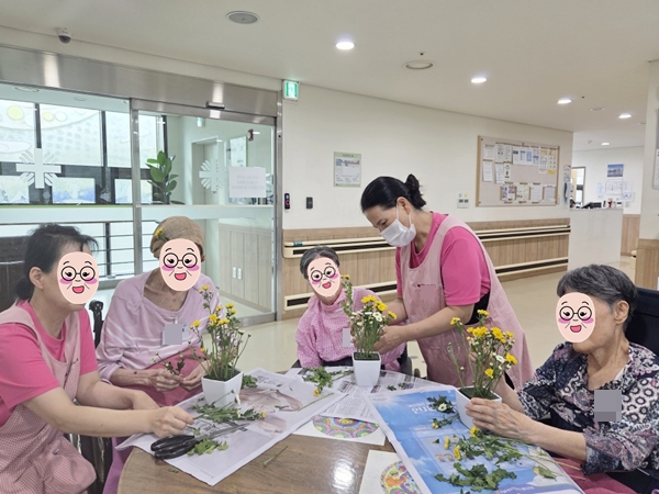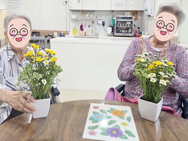 어르신들께서 꽃이 향기롭고 색도 화사하다고 말씀하시면서 아름다운 꽃화분을 완성하셨습니다.