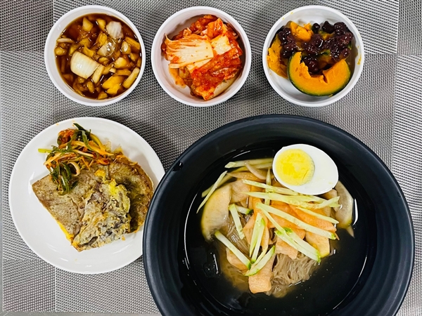 메뉴로는 시원한 물냉면과 촉촉한 소고기 육전이었습니다.