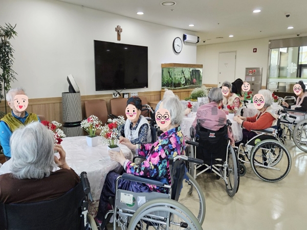 4/1(월) 4층 생활층에서 장미꽃과 안개꽃을 이용하여 꽃꽂이를 만드는 활동을 진행하였습니다.